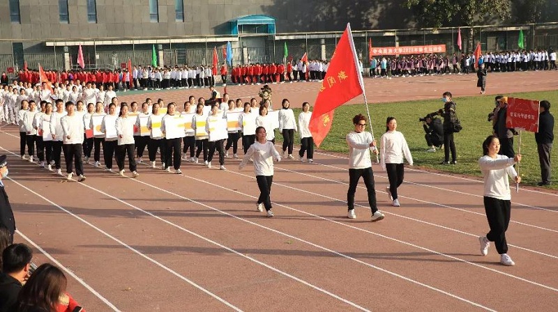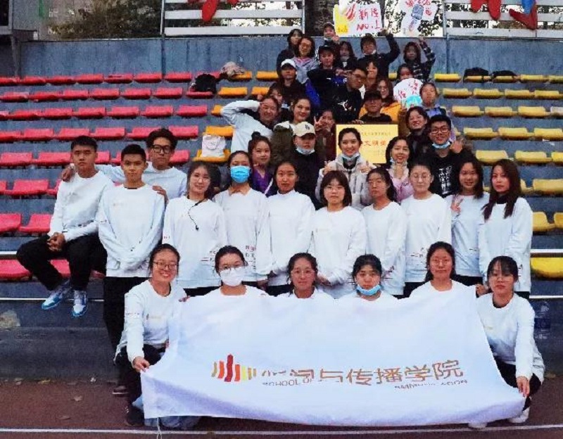 方阵整齐列队,精神抖擞;在行进中高喊口号:“新传新传,造就不凡,博闻明辨、活力无限”,走至主席台前方阵进行队形变换,举起KT板拼出我院院徽。