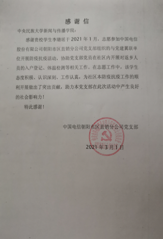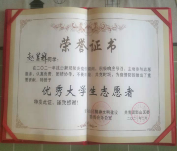 在新冠疫情防控的前沿阵地上,我院学子积极响应党和国家的号召,用年轻的肩膀扛起社会责任,为打赢疫情防控阻击战奉献爱心和力量,赢得社会各界的好评。在当地党委政府的统一指挥下,他们有序参与疫情防控工作,以无私的奉献为所在城市增添了更多暖色,当地对我院学子不惧风险、迎难而上投身家乡疫情防控表示最诚挚的感谢和崇高的敬意,并致以感谢信和表彰证书。