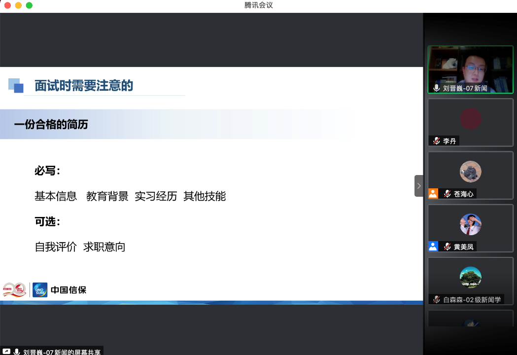 2002级本科毕业生白森森师兄和2007级本科毕业生刘晋巍师兄。两位师兄结合自身求职经验与工作经历为我们分享包括国企面试心得、就业情况等多方面实用信息,帮助我们更深入地了解国企就业现状,以便更好地作出规划。