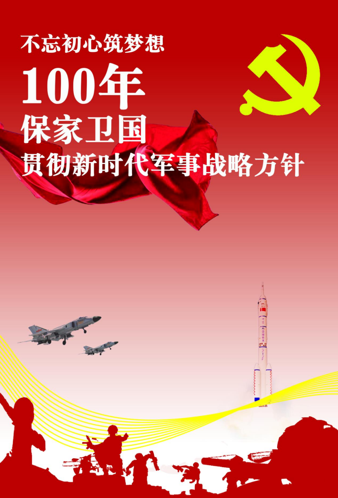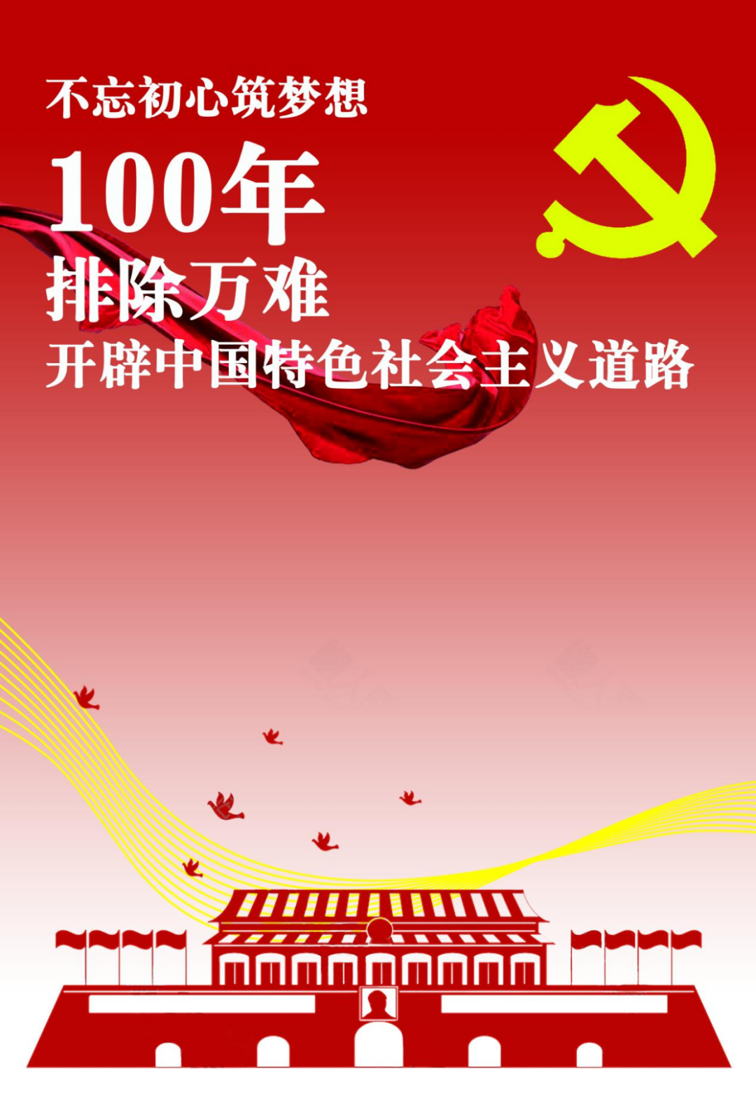 以三组分别代表政治、军事和人民三个方面的剪影为画面的主要部分;呈现和回顾中国共产党在百年历史中为中国作出的贡献。主要色调为红色和黄色,与党的主色调相符,让观者能够感受到党的光辉。是回顾,也是传承,红色的飘带扬起的便是我们对未来的展望,100年,初心不变,我们要带着动人的故事继续前行。
