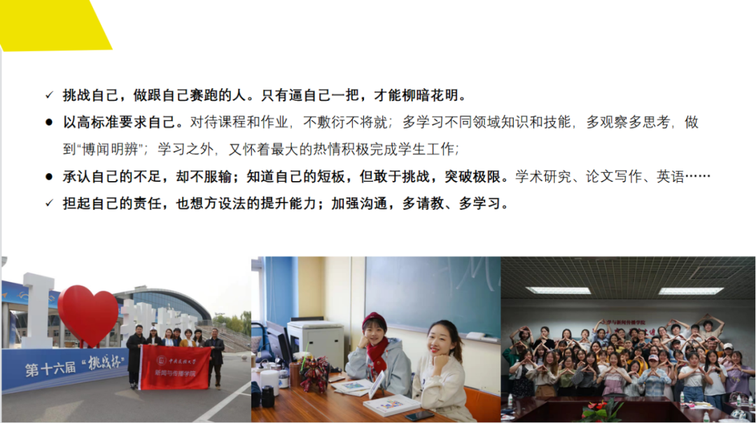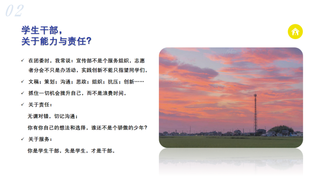 在工作效率提升培训中,主讲人崔艺璇结合自身经历,从“寻找方向”“厚积薄发”“挑战自己”和“珍惜当下”四个角度分享了她的心得。她强调学生干部应担起责任,敢于挑战,提升沟通能力,勇于承认自身不足并及时改正,走出舒适区。最后崔艺璇学姐建议大家做好时间平衡,追求自我完善。