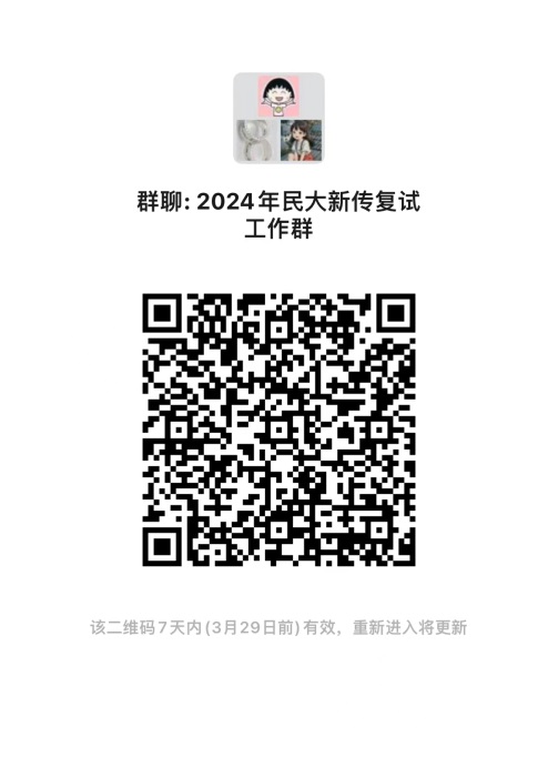 请扫描“2024年民大新传复试工作群”二维码进群。